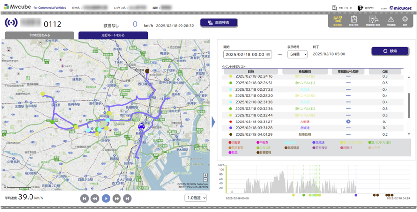 また、運転傾向を分析する運転診断機能や危険ポイントの抽出など、クラウドサービスならではの安全運転支援機能を搭載。走行履歴の確認、過去イベント映像検索、動態管理、SOSメール送信、乗務員認証など、車両管理業務を支援する機能も備えています。